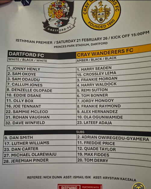 Re: Dartford v Cray Wanderers Sat 21 Feb 2026