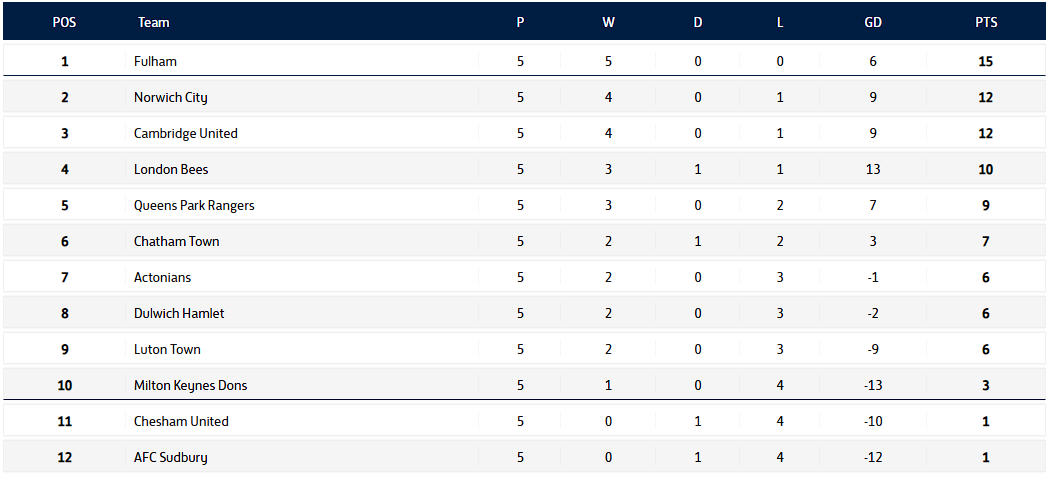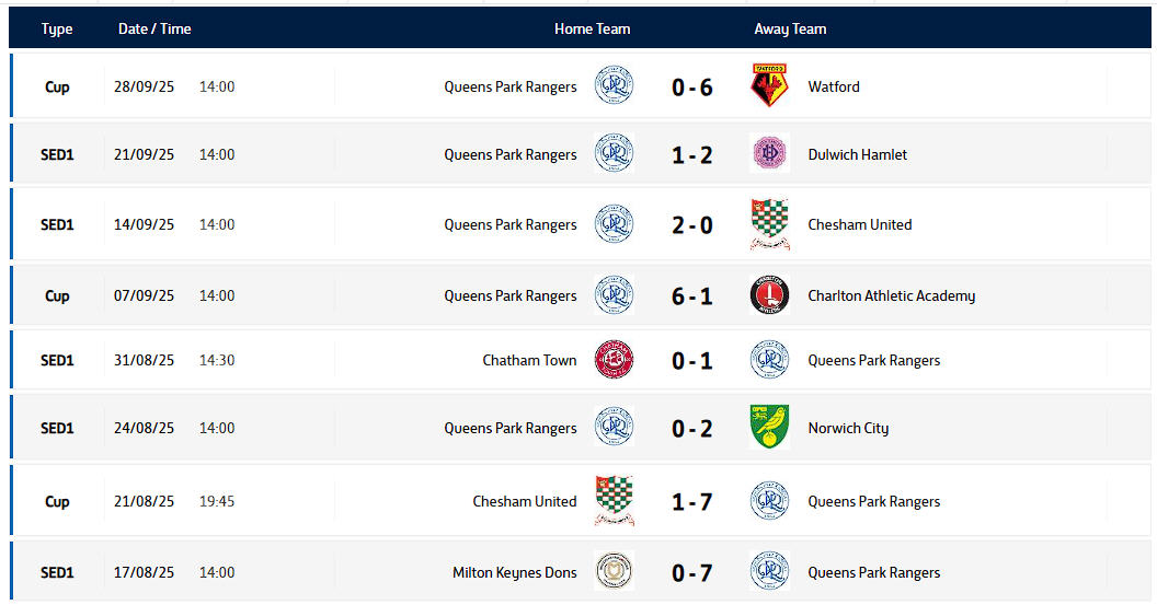 QPR play in the FA Women's National League - Division One South East (Tier 4, Darts are Tier 5) and here are their results this season and where they stand in the league.