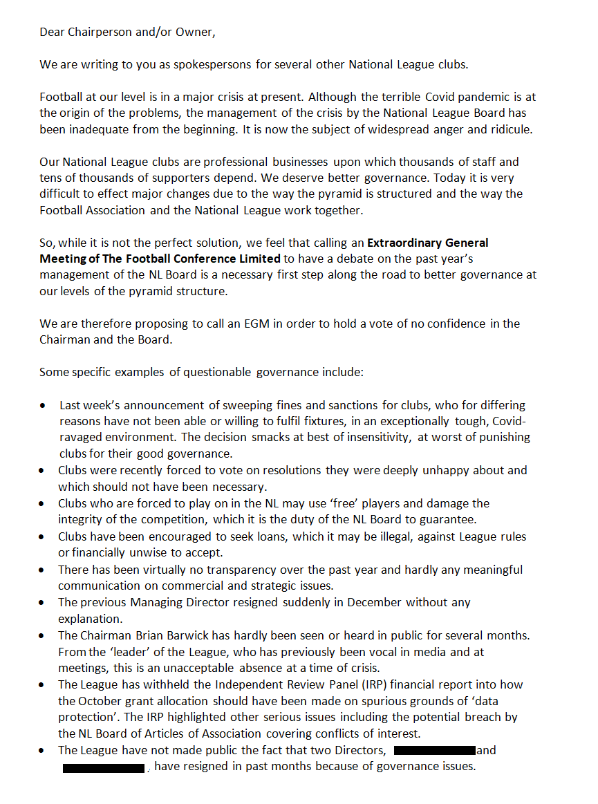 National League clubs have been asked if they will support an EGM to debate this resolution: