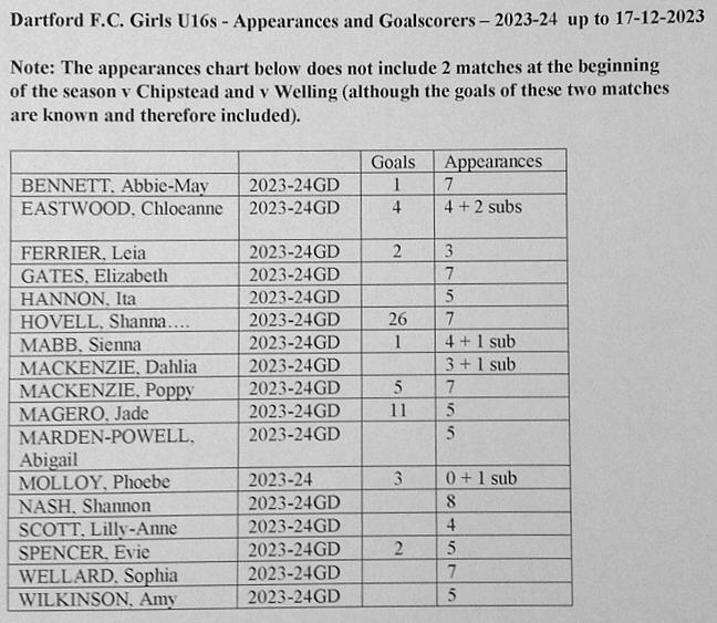 This second part shows the League Table and the Goal-scorers and Appearances chart for the U16s.