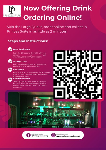 1. Avoid the queues at the bar by using the attached QR Code. You can pre-order your drinks with ease and collect them from the Princes Suite. Follow the instructions on the graphic.