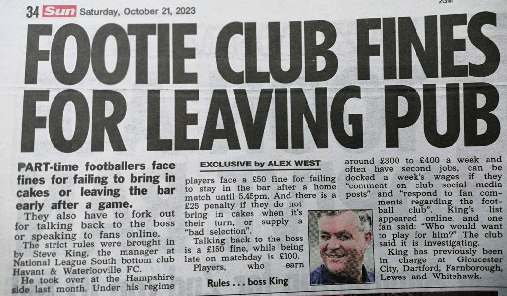 The paper are reporting what is already out there , its not like they made it up . It came from a Havant player ( possibly ex player now ) several days before the paper picked it up and ran with it . It went viral.Lennylenny wrote: Mon Oct 23, 2023 6:53 pm Havant have posted they are taking legal action about this. We held the moral ground till this, does anyone really believe it? King can be a cock but really over cakes? As a ex manager who was penalties away from taking us to conference from relegation , he deserves more respect. End day we all football fans to post things from a paper who slandered the dead and injured at hillsbourgh, is below us