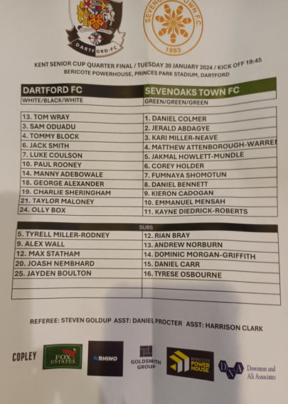 Re: KSC Quarter Final Dartford v Sevenoaks Town Tue 30 Jan 2024