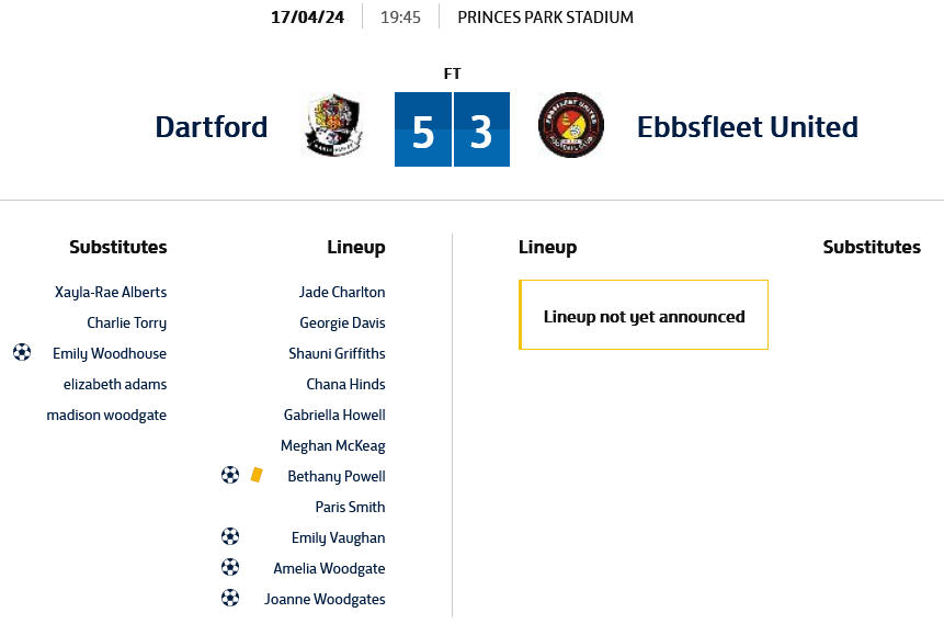 Don’t forget they have a cup final this Sunday against 5th place Saltdean United, who beat the Darts in a 4-3 thriller last month. The reverse fixture Dartford won 2-0. So should be a close final.