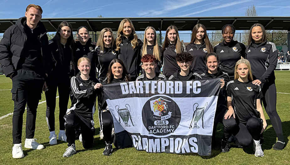 CHAMPIONS! Dartford FC Girls Academy led by manager George Kingdon, line up for a team photo before the Men’s Isthmian League match with Chatham Town on Easter Monday. They received a fantastic round of applause from the fans on their wonderful achievement in the Academy’s first year – the winning of the National Youth League, South Championship Women’s Division.